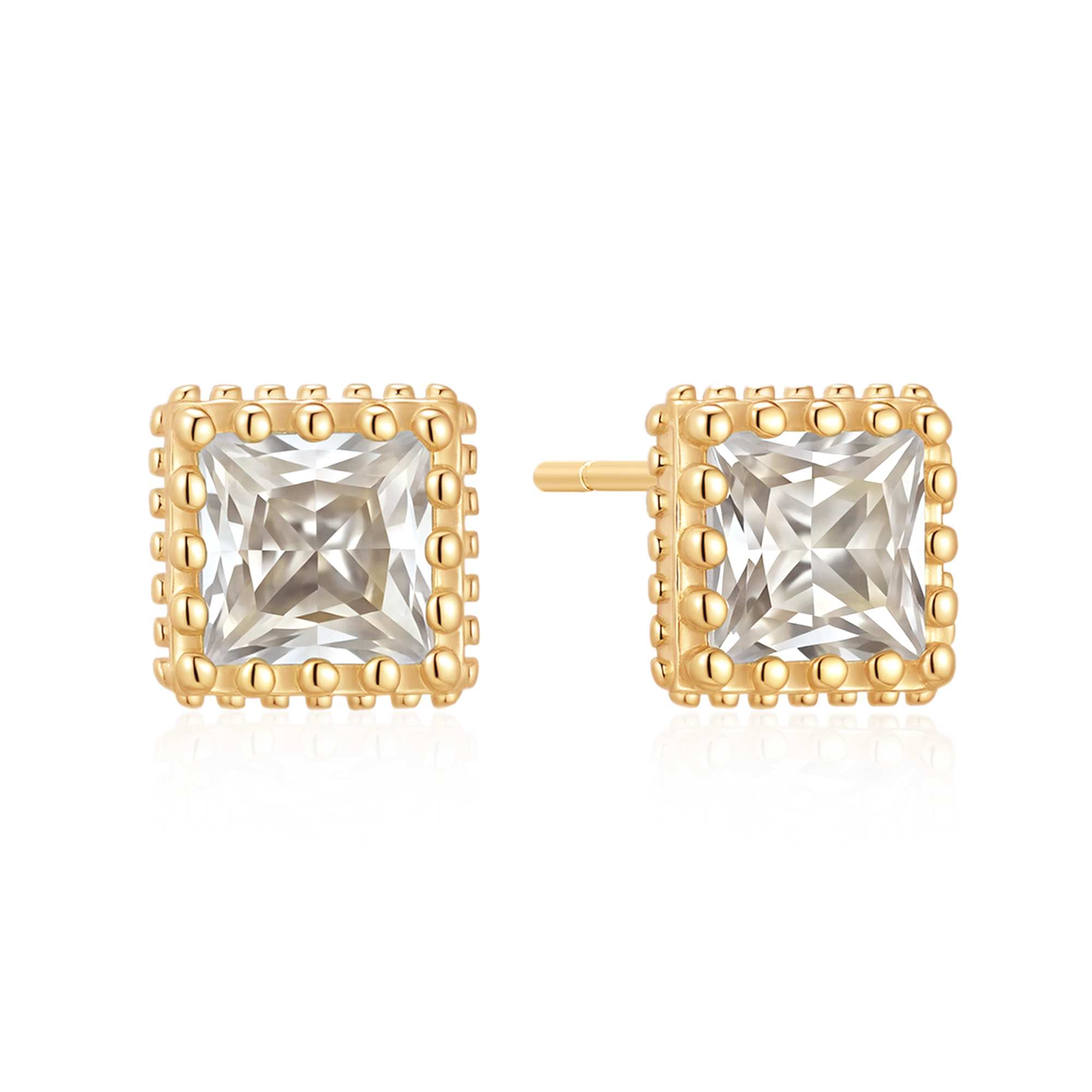 Square earrings with central clear stone, gold border, round embellishments, and visible post attachment.