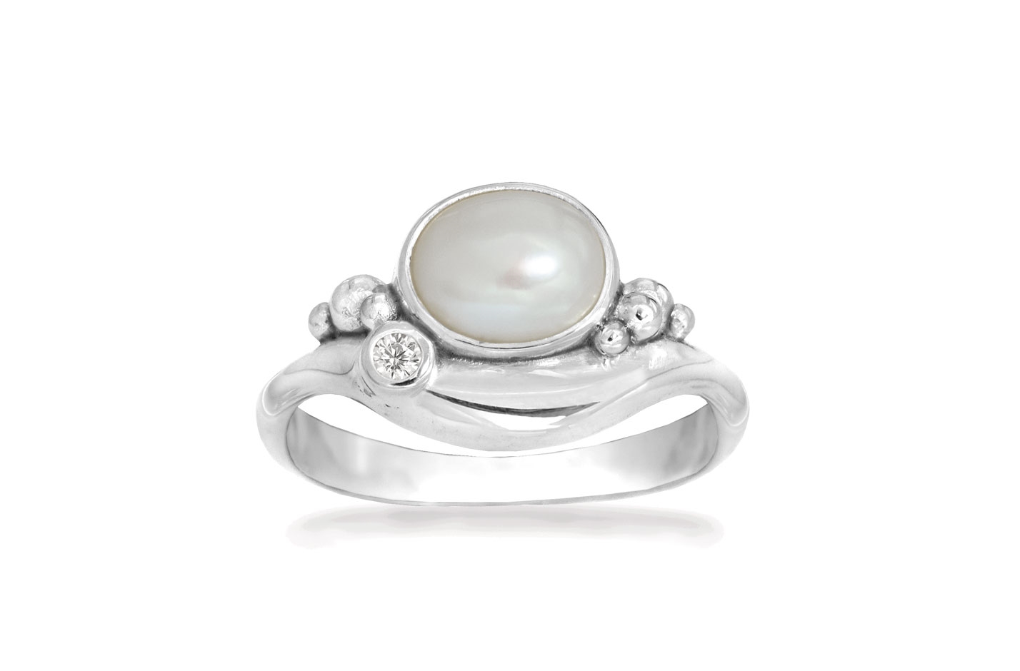 The Sølv ring showcases an exquisite 8.5 x 7.5 mm white freshwater pearl as its centerpiece, creating a sophisticated focal point perfect for formal events. The sterling silver craftsmanship ensures lasting beauty, while decorative elements and a 2 mm zirconia stone add subtle sparkle without overwhelming the pearl's natural luster.