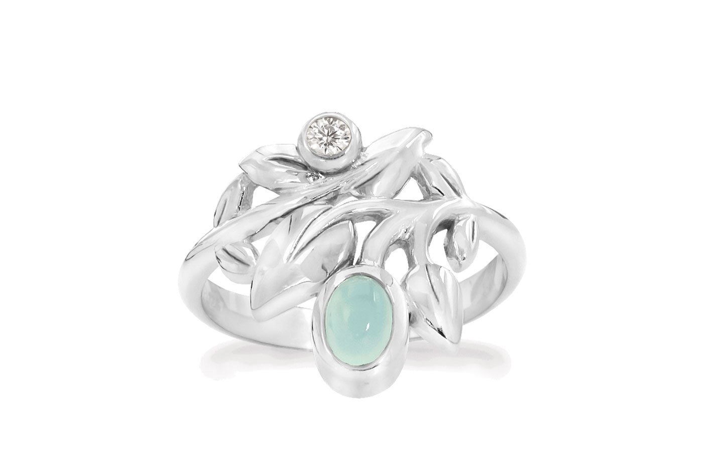 The Sølv ring - Vitality showcases an intricate leaf motif design crafted in sterling silver, featuring a stunning 6x4 mm chalcedony stone that adds a serene touch of light blue. The design is enhanced by a sparkling 2.5 mm zirconia stone, creating a harmonious blend of natural elements and refined craftsmanship.