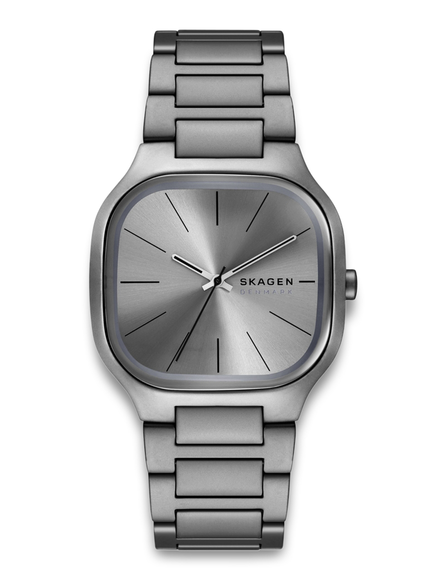 This Skagen watch impresses with its striking square stainless steel case that adds a special architectural expression. The gray dial with clear index markings ensures optimal readability in all conditions. The metal strap in the same finish as the case and the precise quartz movement complete the elegant design.