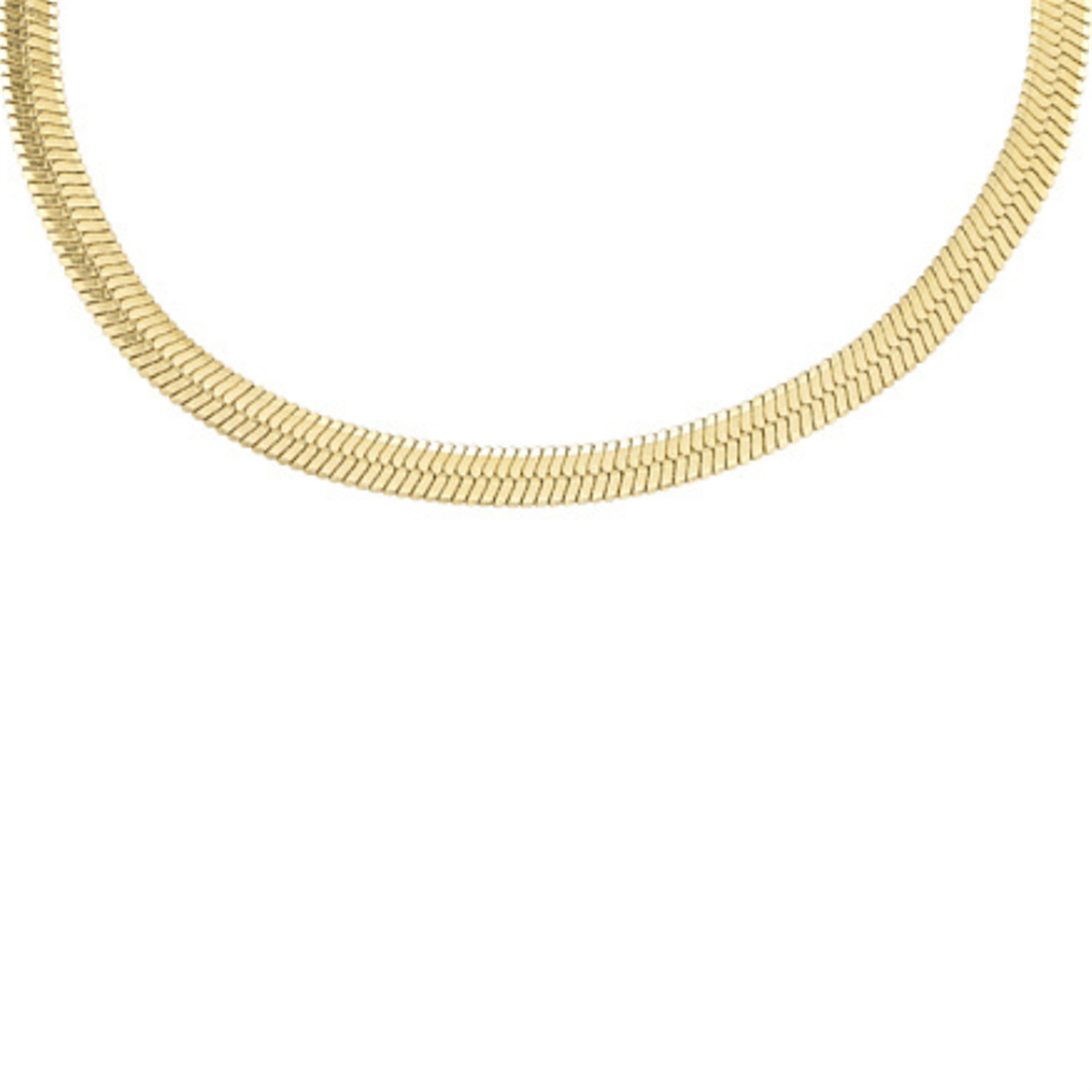 Bredt slangehalskæde i stål, belagt med 14 karat guld, et smukt og klassisk design. Halskæden er 5 mm bred og længden er 42 cm + 3 cm forlænger. Vandfast med unik holdbarhed.