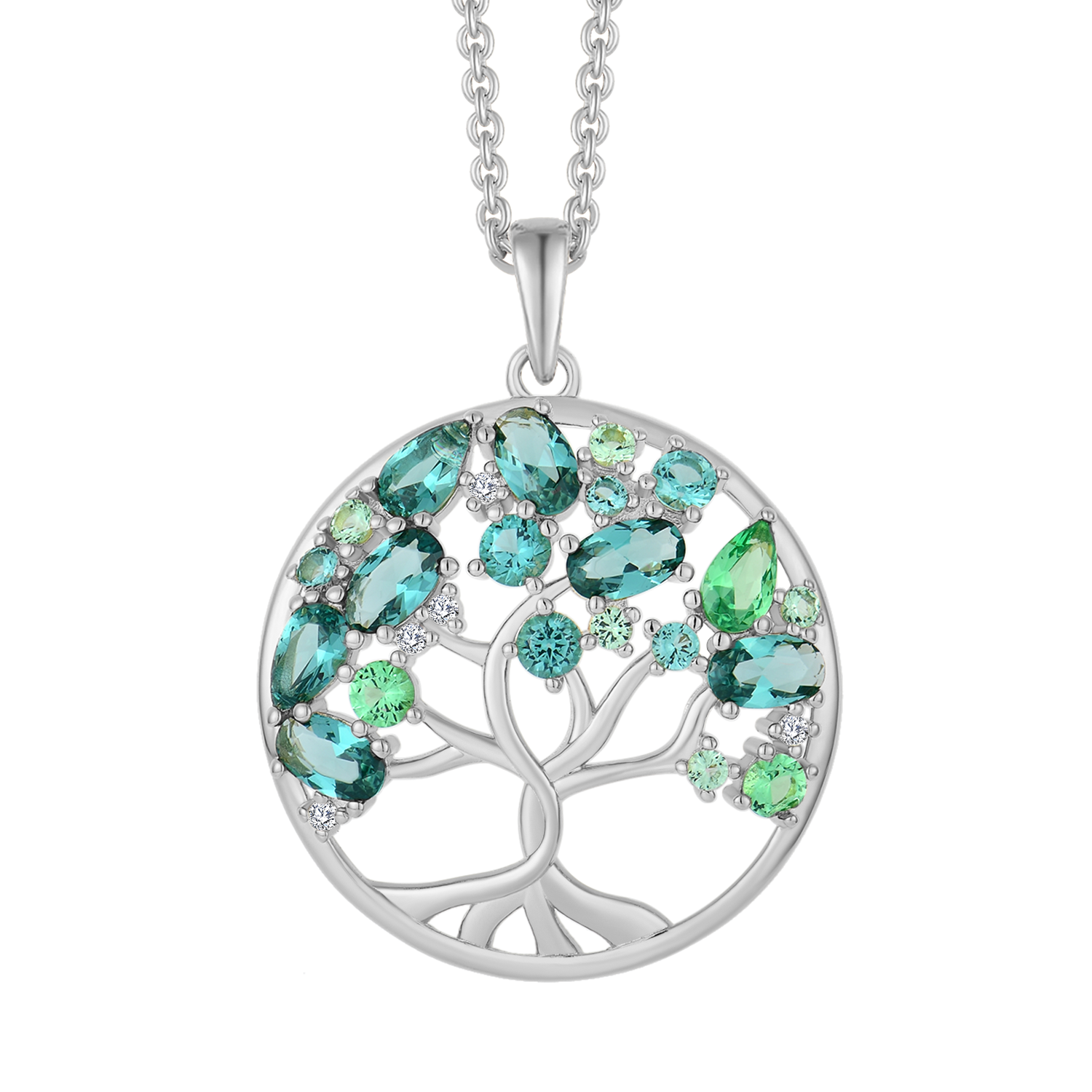 Sølv halskæde rhodineret cirkel med livets træ i forskellige syntetiske cubic zicornia grøn. "Tree of life"