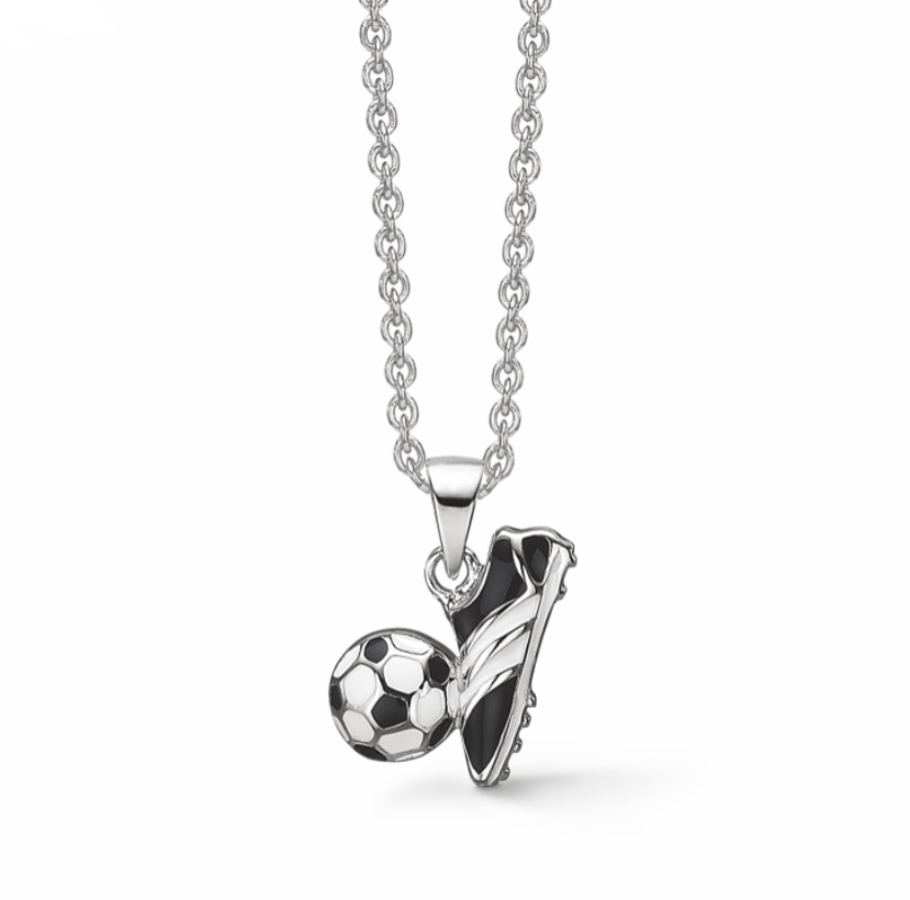 Sølv halskæde fodboldstøvle og bold med hvid og sort blyfri emalje.