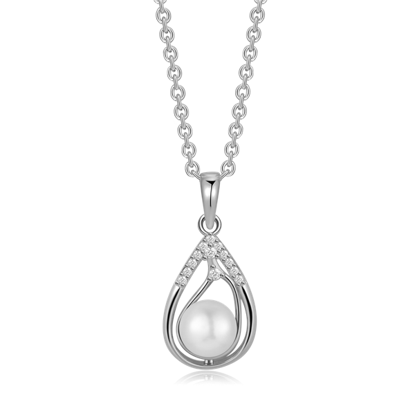 Sølv halskæde rhodineret dobbelt dråbe med syntetiske cubic zirconia og ferskvandsperle.