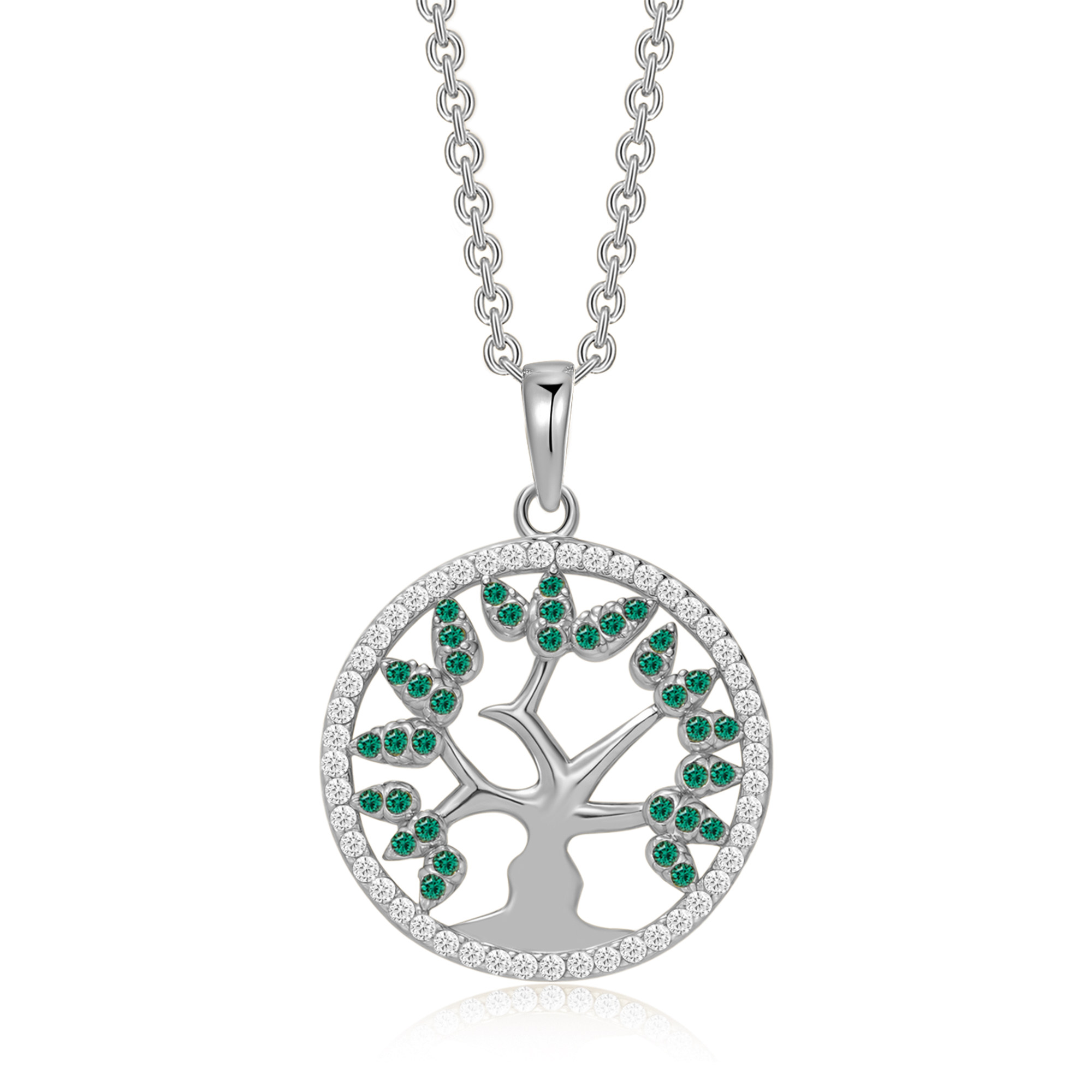 Sølv halskæde rhodineret livets træ med grøn syntetiske cubic zirconia som blade.