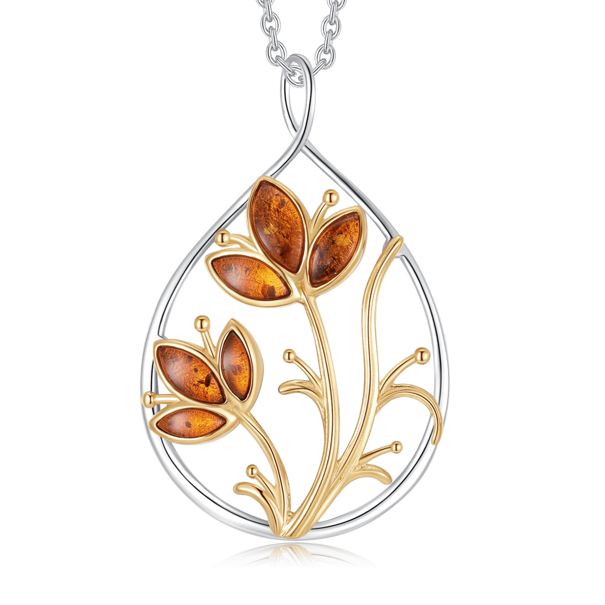Sølv halskæde rhodineret rhodineret stor oval med forgyldt grene og blomster blade i rav.