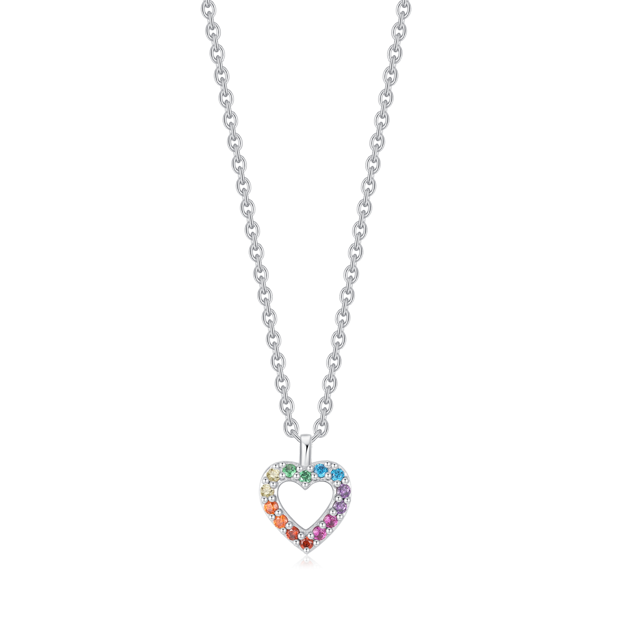 Sølv halskæde hjerte med multi farver syntetiske cubic zirconia rundt om kanten.