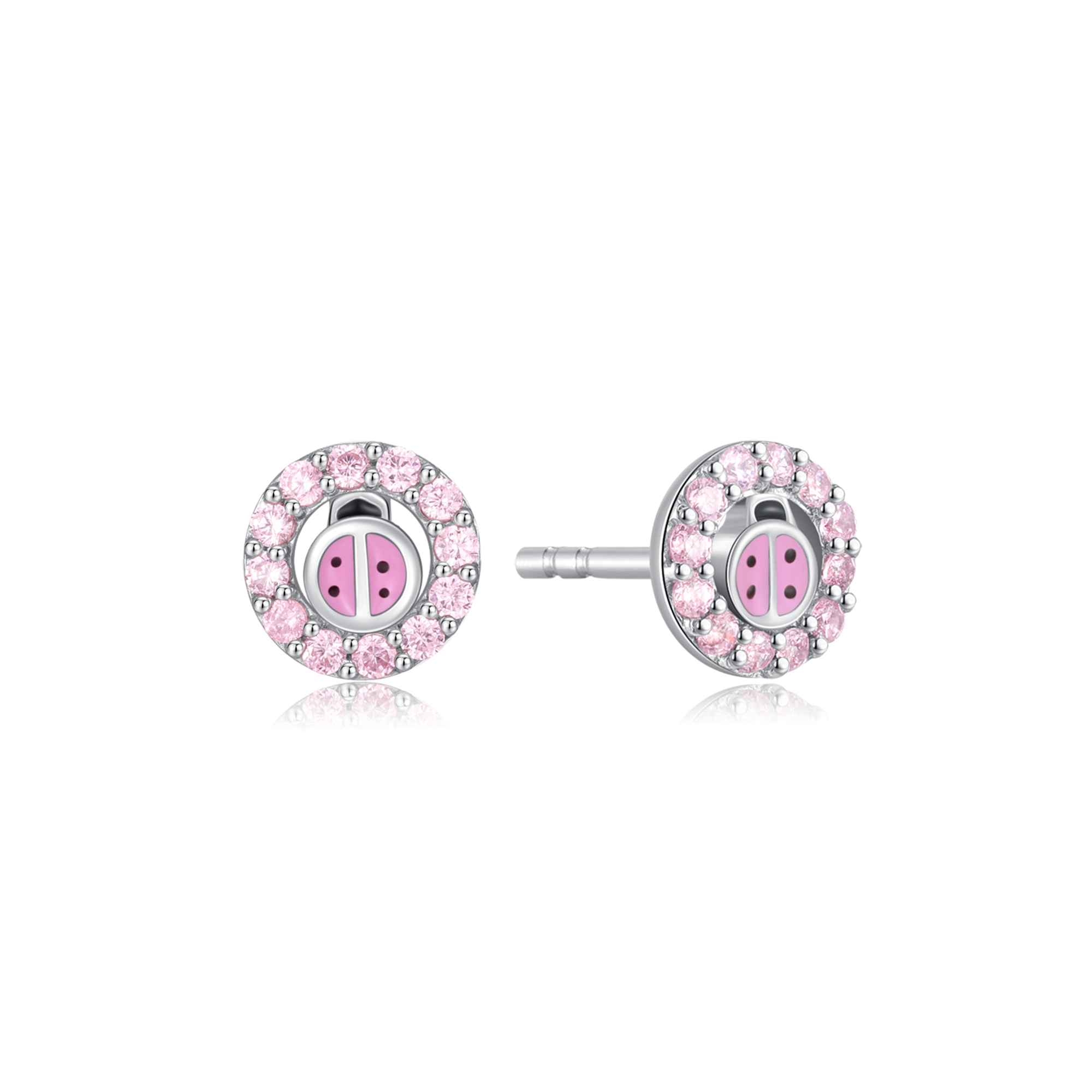 Sølv ørestikker rhodineret cirkel med mariehøne i lyserød blyfri emalje og syntetiske cubic zirconia.