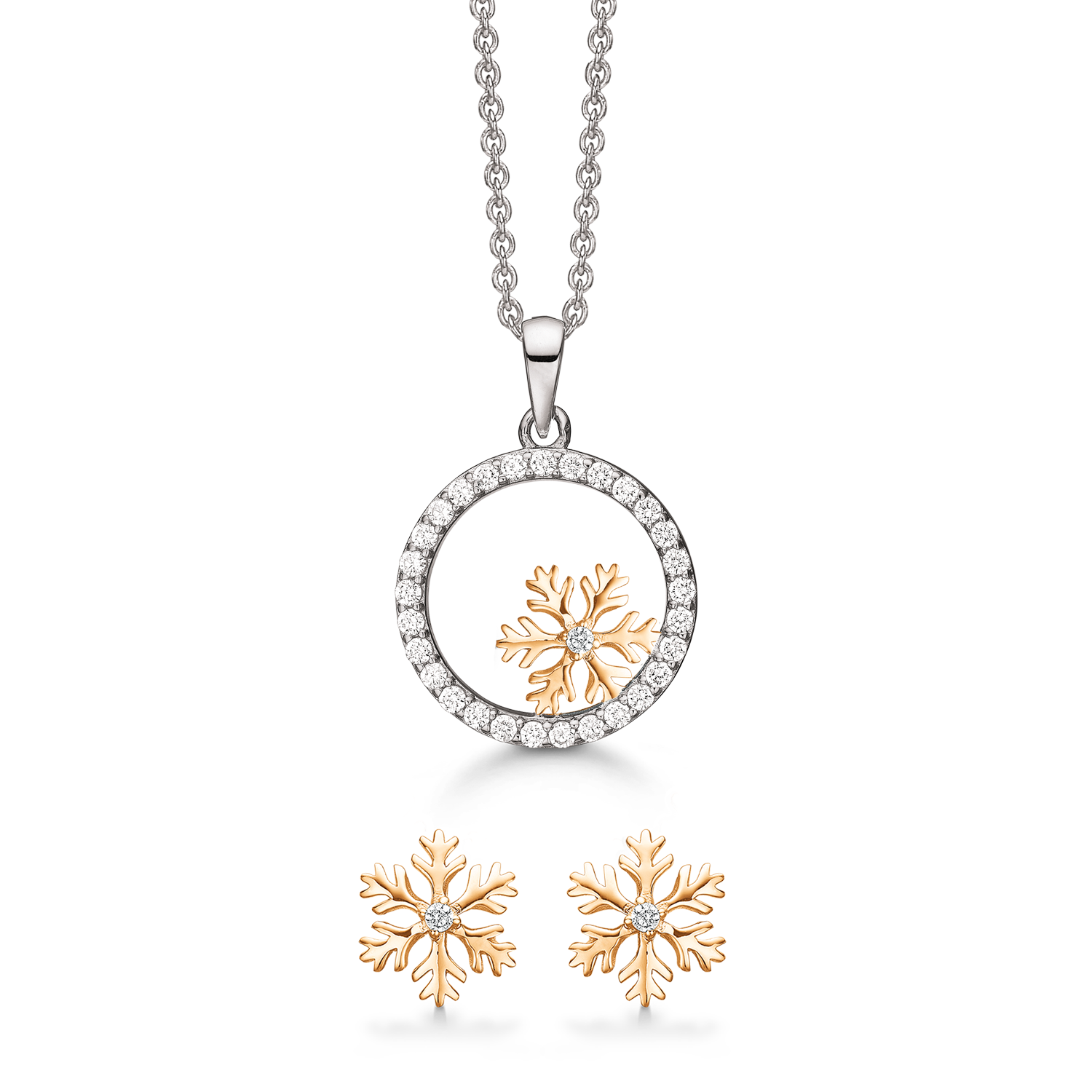 Sølv smykkesæt rhodineret/forgyldt snefnug med syntetiske cubic zirconia i midten. Ørestikkerne er forgyldt.