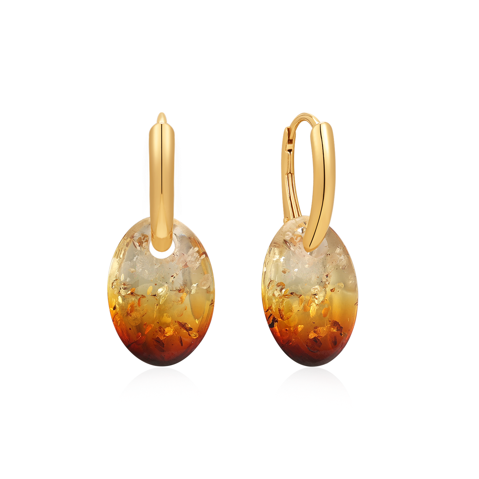 Sølvforgyldt knækcreoler med rav i oval form som hænger.