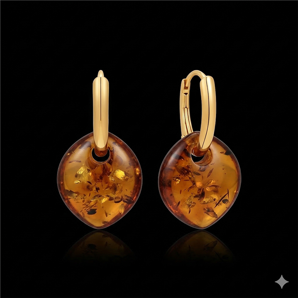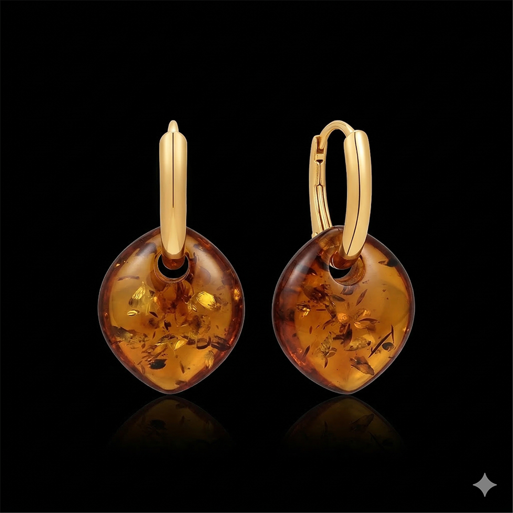 Sølvforgyldt knækcreoler med rav i dråbe form som hænger.