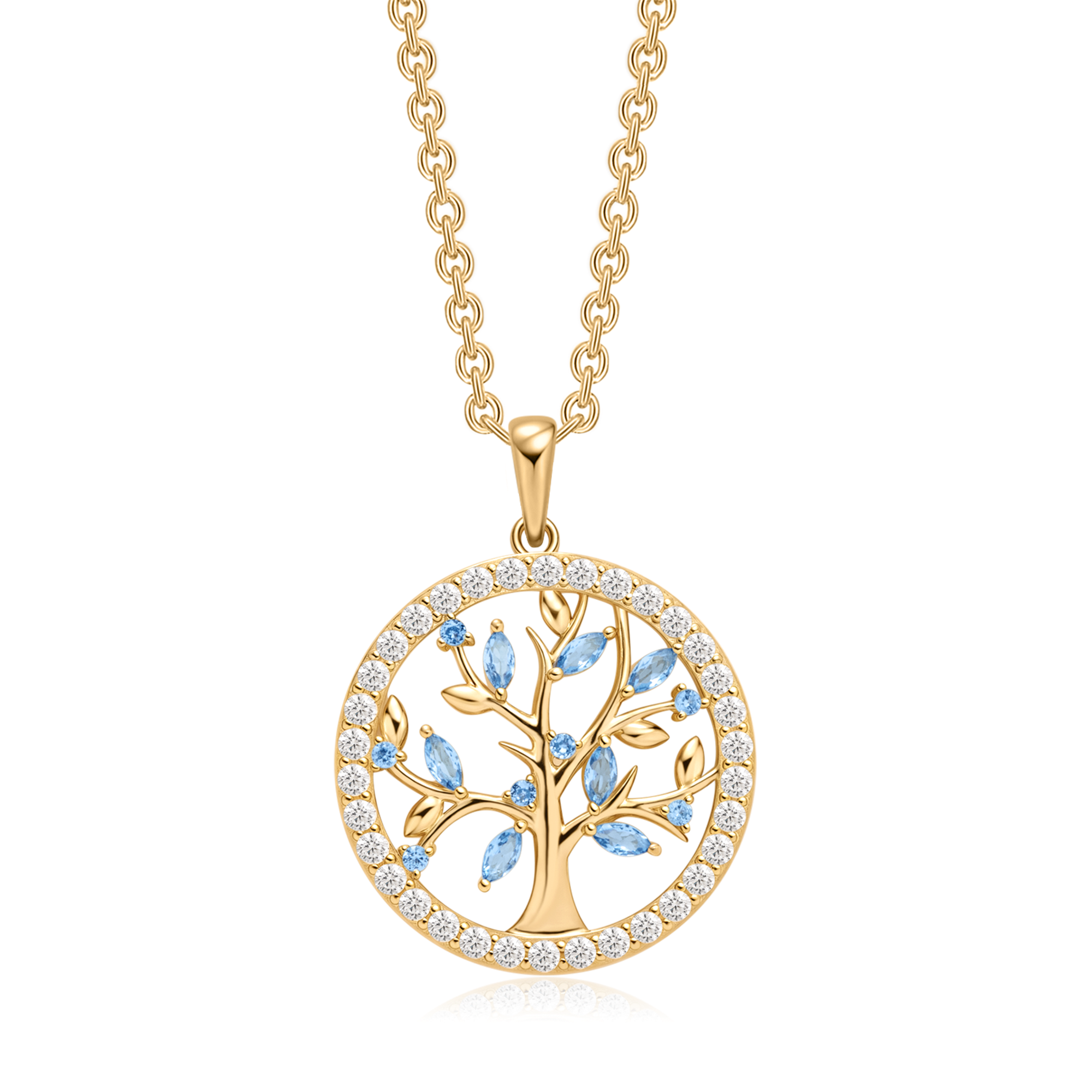 Sølvforgyldt halskæde livet træ i cirkel med blå syntetiske cubic zirconia.
