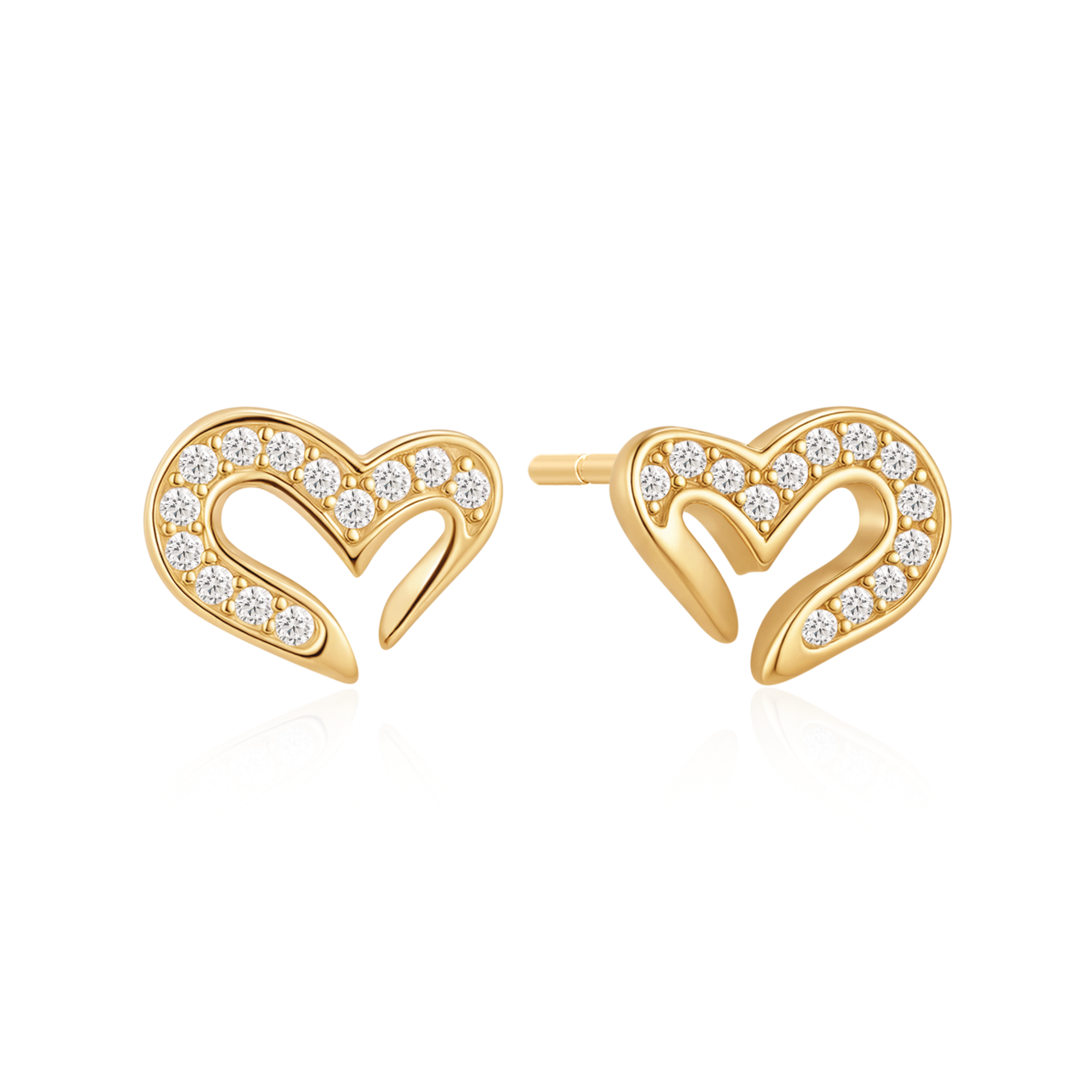 Heart-shaped, gold stud earrings with small round stones and polished finish.