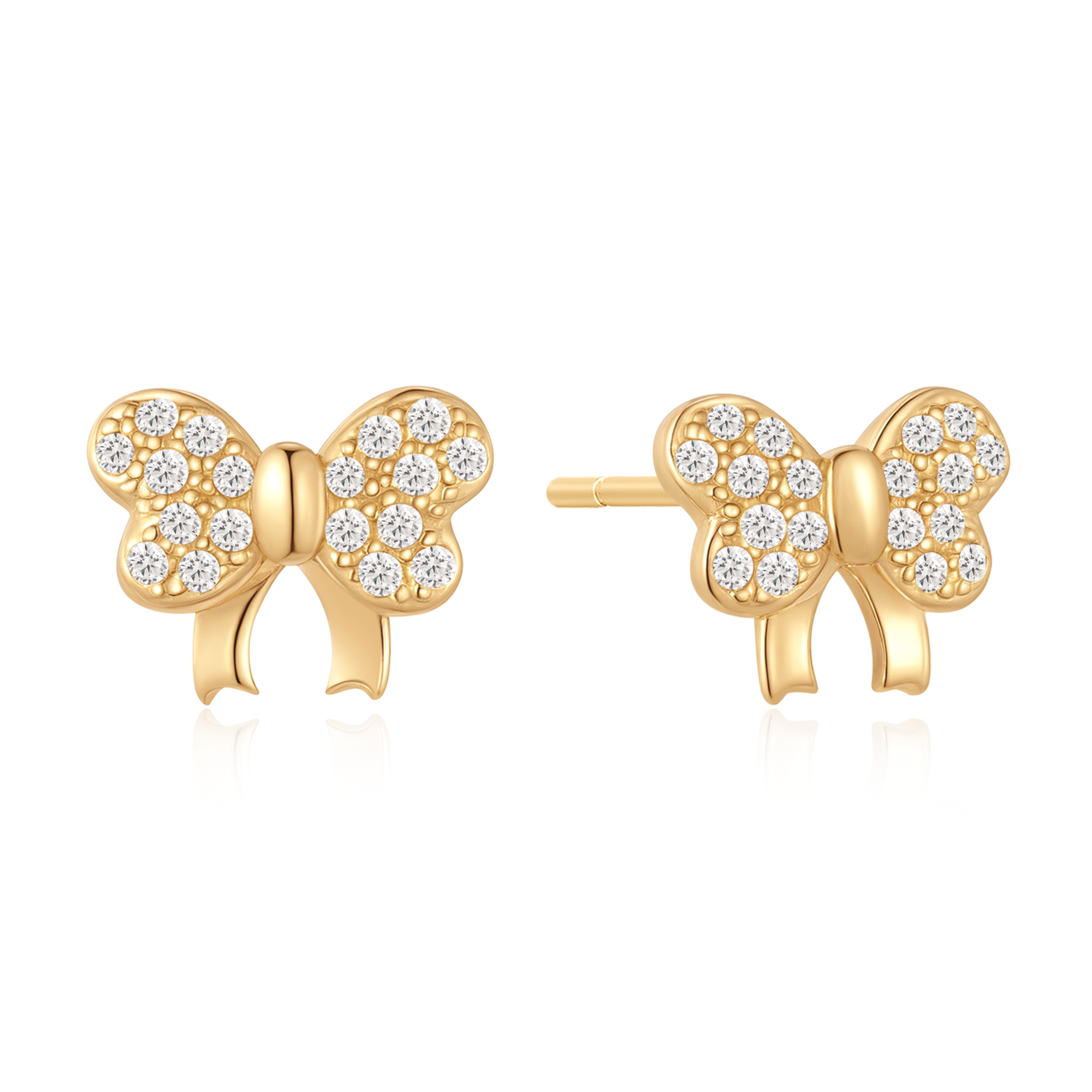 Gold bow-shaped stud earrings with clear stones and polished finish, side view of fastening visible.