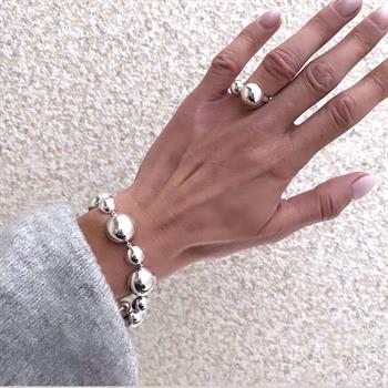 The Sophia silver bracelet showcases a stunning, reflective, polished finish that captures and reflects light beautifully throughout the day. Its sophisticated design features meticulously crafted spherical elements of varying sizes, creating a dynamic pattern that transitions seamlessly from day to evening wear.
