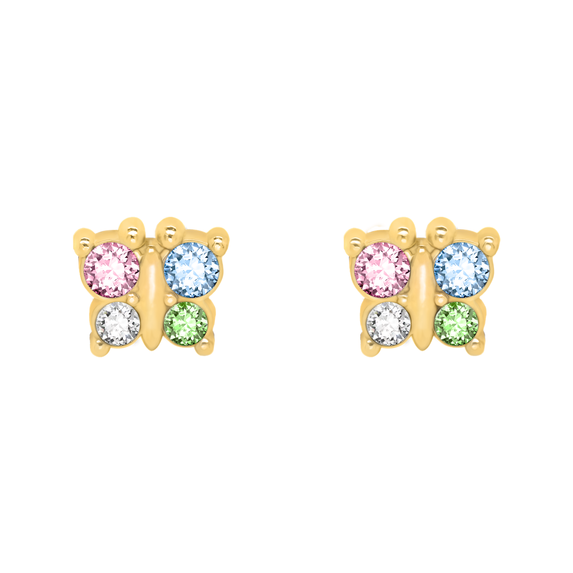 Gold butterfly earrings with pink, blue, white, and green stones from Støvring Design.