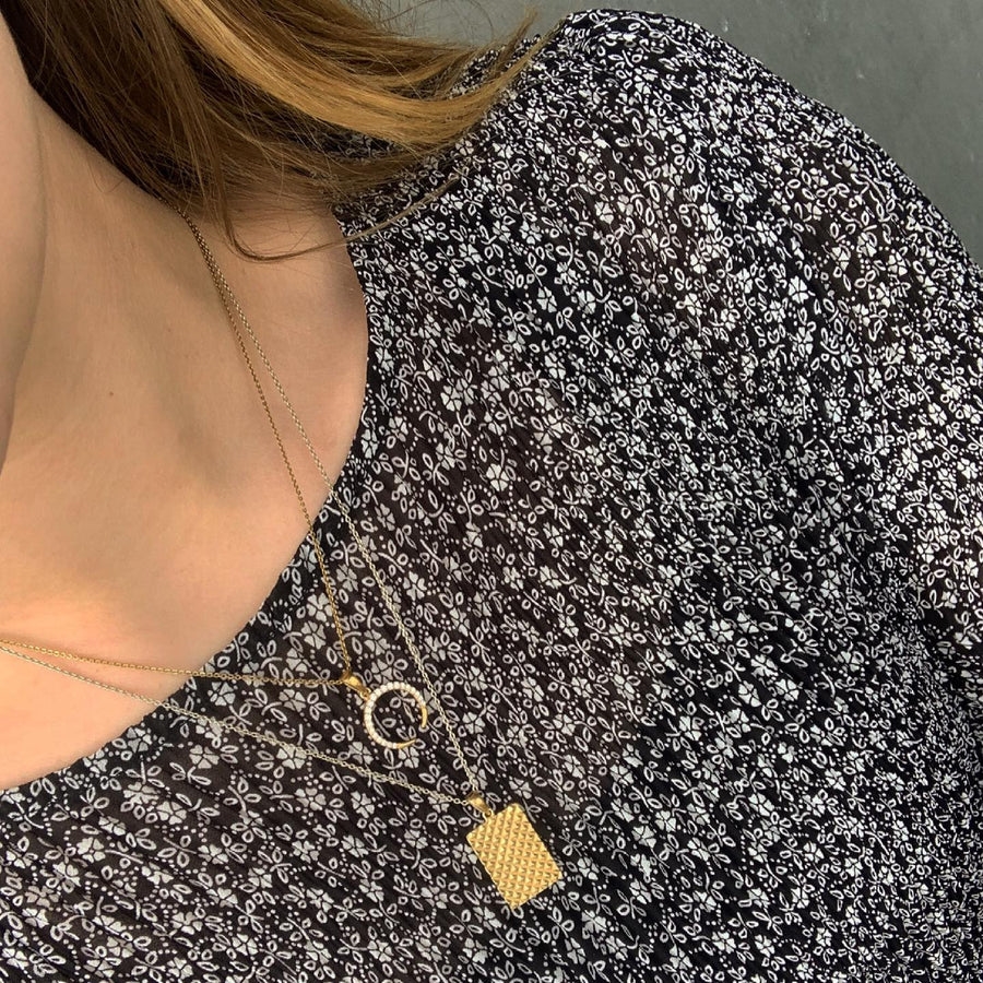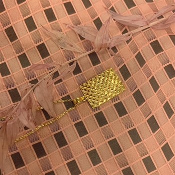Necklace with small plate. The front is adorned with a pattern of squares while the back is engraved with "Enjoy Today", 11 x 15 mm