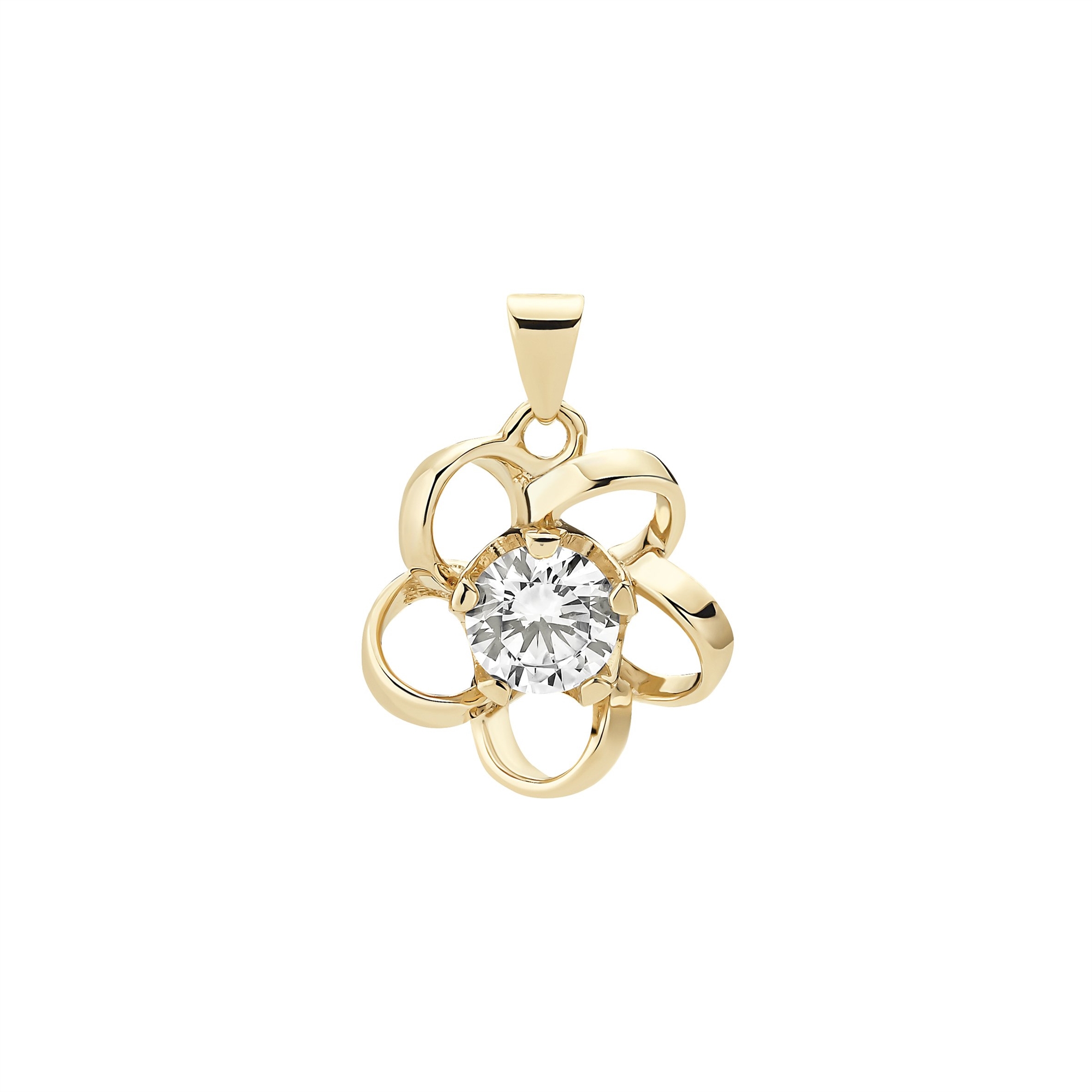 Gold flower pendant with central zirconia stone and top loop for chain attachment.