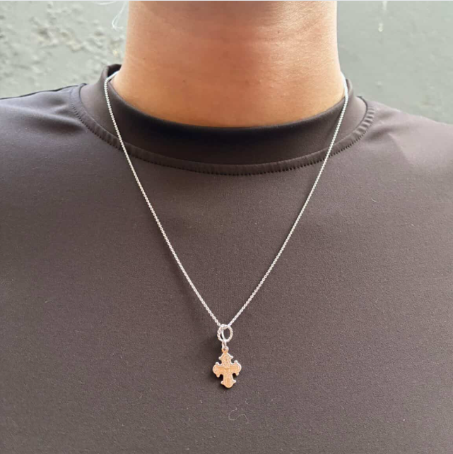 Cross-shaped silver pendant with intricate engravings, twisted loop, and small rounded edge protrusions.